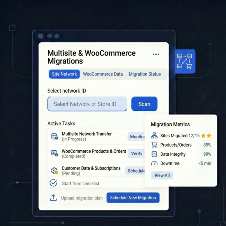 We specialize in large‑scale WordPress Website Migration for Multisite networks and WooCommerce stores, ensuring smooth transitions without downtime or data loss.